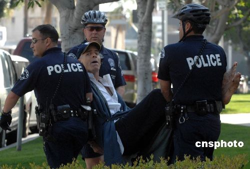 當(dāng)?shù)貢r間三月十日下午,一名手持“藏獨(dú)”旗幟的男子突然越過欄桿,沖到中國駐洛杉磯總領(lǐng)館大門前,一邊高喊“藏獨(dú)”口號,一邊拍打大門,并試圖打開大門。隨后該男子被警察當(dāng)場擒獲,戴上手銬后被押上警車帶離現(xiàn)場。中新社發(fā) 張煒 攝