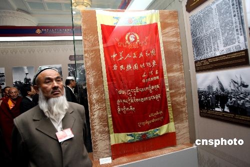 3月11日,參加全國(guó)政協(xié)會(huì)議的維吾爾族委員白克力·馬木提參觀在北京民族宮舉辦的西藏民主改革50年大型展覽。中新社發(fā) 傅丹丹 攝