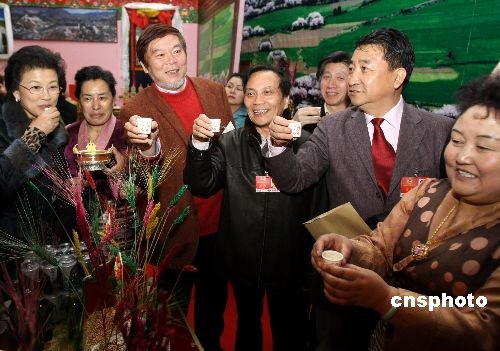 3月11日,參加全國政協(xié)會議的文藝界委員參觀在北京民族宮舉辦的西藏民主改革50年大型展覽。圖為委員們在西藏民居風(fēng)格的布景館里共飲酥油茶。中新社發(fā) 傅丹丹 攝