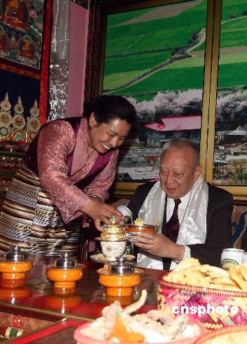 3月11日,參加“兩會”的全國政協(xié)副主席董建華,前往北京民族文化宮參觀“西藏民主改革50年展覽”。圖為董建華在參觀時(shí)感受藏族民俗。中新社發(fā) 張宇 攝