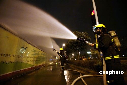 圖為消防官兵沿途對(duì)工地進(jìn)行稀釋。中新社發(fā) 袁帆 攝