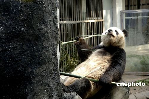 三月十二日,去年從四川地震災(zāi)區(qū)轉(zhuǎn)移到福州的大熊貓?jiān)诟V菪茇埵澜缋,躺在明媚陽光下,悠閑地吃著竹子。中新社發(fā) 王東明 攝