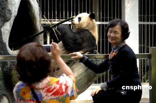 三月十二日,臺灣游客在福州熊貓世界與熊貓近距離合影留念。大熊貓“團團”、“圓圓”在臺灣產(chǎn)生的效應(yīng),致使現(xiàn)在來福州觀看熊貓的臺灣游客比以前增加三倍以上。中新社發(fā) 王東明 攝