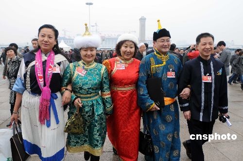 2009年3月12日上午,中國人民政治協(xié)商會議第十一屆全國委員會第二次會議圓滿完成各項議程后在人民大會堂閉幕。圖為在人民大會堂前的少數(shù)民族代表。中新社發(fā) 宋健浩 攝
