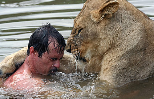 據(jù)悉,34歲的理查德森是一位動(dòng)物行為學(xué)家,他能夠與人類認(rèn)為最危險(xiǎn)的動(dòng)物十分融洽地生活在一起。這頭名叫“瑪格麗塔”的母獅重達(dá)185公斤,它很喜歡與理查德森開(kāi)玩笑,時(shí)常將河中的水撥濺在他的身上,還在河中與他相擁相抱,有時(shí)將前爪搭在他的肩膀上。