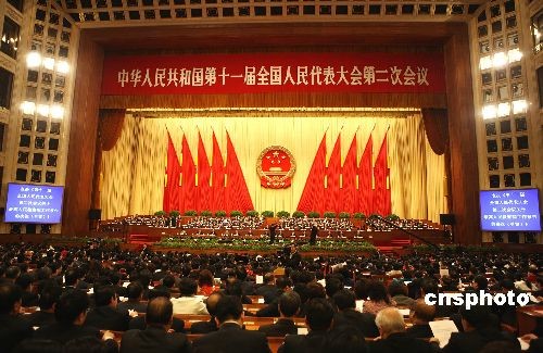3月13日上午,第十一屆全國(guó)人民代表大會(huì)第二次會(huì)議在北京人民大會(huì)堂舉行閉幕會(huì),與會(huì)代表表決通過(guò)了關(guān)于政府工作報(bào)告的決議草案、關(guān)于2008年國(guó)民經(jīng)濟(jì)和社會(huì)發(fā)展計(jì)劃執(zhí)行情況與2009年國(guó)民經(jīng)濟(jì)和社會(huì)發(fā)展計(jì)劃的決議草案、關(guān)于2008年中央和地方預(yù)算執(zhí)行情況與2009年中央和地方預(yù)算的決議草案、關(guān)于全國(guó)人民代表大會(huì)常務(wù)委員會(huì)工作報(bào)告的決議草案、關(guān)于最高人民法院工作報(bào)告的決議草案、關(guān)于最高人民檢察院工作報(bào)告的決議草案后閉幕。中新社發(fā) 任晨鳴 攝