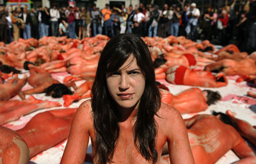 3月15日,西班牙馬德里,動物保護(hù)協(xié)會成員身涂人造血,抗議捕獵海豹。
