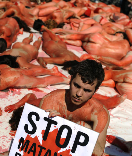 3月15日,西班牙馬德里,動物保護協(xié)會成員身涂人造血,抗議捕獵海豹。