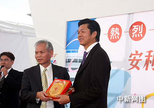 圖為臺灣海峽兩岸觀光旅游協會秘書長吳朝彥向安利大中華區(qū)行政總裁顏志榮致贈臺北縣新莊百年老店的傳統(tǒng)喜餅。
