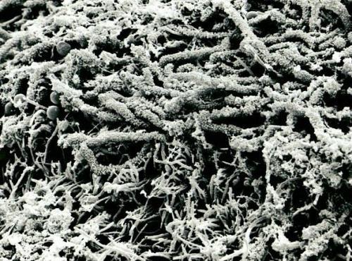 血液凝塊:這張圖看起來像是紅血球粘在了粘性網(wǎng)上,形成血液凝塊。位于中間的那個細胞是白血球。