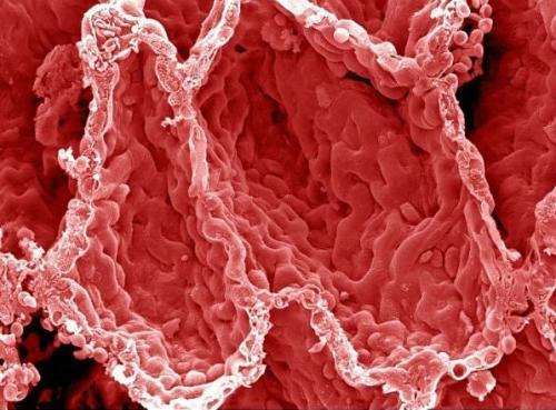 肺氣泡:這張彩色圖片顯示的是人類肺部?jī)?nèi)表面。圖中的洞穴是肺氣泡,這里是血液交換氣體的地方。