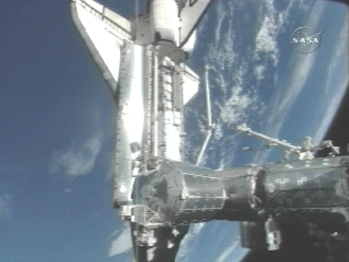 圖為美國國家航空和航天局發(fā)布的“發(fā)現(xiàn)”號與國際空間站對接電視截圖。