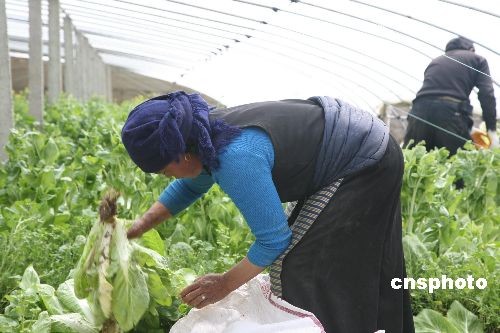 近年來,用溫室大棚種植蔬菜在西藏日益推廣。在強(qiáng)烈的日光照射下,大棚內(nèi)溫暖如春。就是在青黃不接的冬春時(shí)節(jié),大棚內(nèi)都可生長各種新鮮蔬菜供應(yīng)市場。圖為3月17日拉薩近郊曲水縣的一對(duì)藏族夫婦在收獲大白菜。中新社發(fā) 王林 攝