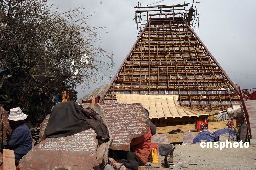 3月18日,經(jīng)過14年的鑿刻和修建,西藏最大的石經(jīng)塔——“甘珠爾曲東”有望在今年6月完整地呈現(xiàn)在世人面前,并將成為信徒們轉(zhuǎn)經(jīng)以及朝佛的又一重要目的地。這座位于拉薩城中心、布達(dá)拉宮斜對面藥王山上的石經(jīng)塔被命名為“甘珠爾曲東”,塔高約30米,共13層,由上百萬塊刻有藏傳佛教經(jīng)典《甘珠爾經(jīng)》文的石板堆砌而成。上百名刻經(jīng)藝人參與了經(jīng)文的雕刻。盡管石經(jīng)塔尚未完全建成,每天已經(jīng)有大量信眾來此轉(zhuǎn)塔祈福。中新社發(fā) 杜洋 攝