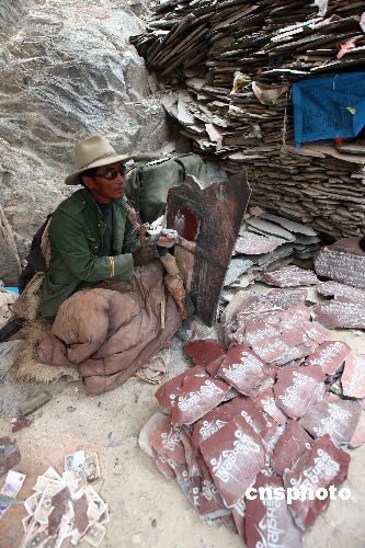 3月18日,拉薩藥王山下的刻經(jīng)人虔誠的在石板上篆刻經(jīng)文。中新社發(fā) 杜洋 攝