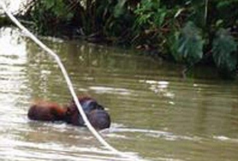 猩猩媽媽背著小猩猩從洪水中游向岸邊。