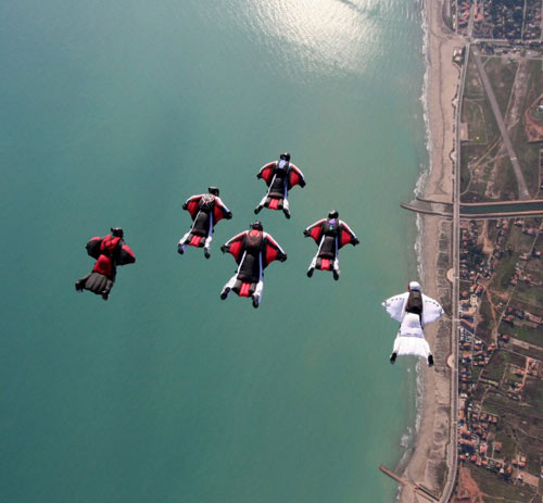 中新網(wǎng)3月21日電,據(jù)英國媒體報道,一幫飛行愛好者近日在德國進行了精彩的翼服飛行編隊表演,他們從距地面近4000米的飛機上跳下,以193公里的時速滑行,彼此之間只有幾厘米的間隔。這些勇敢者只戴著頭盔,穿著價值1000英鎊的翼服,他們的腳踝處還綁著發(fā)煙罐。在空中,他們就像一群紅色的蝙蝠。不僅完成了完美的空中編隊,還像飛機一樣在身后留下一串煙霧。在距地面914米時,翼服飛行愛好者們打開降落傘,降落至地面上。