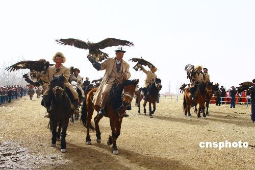 3月20日,新疆阿合奇縣舉辦第二屆獵鷹節(jié),當地柯爾克孜族民眾聚集在該縣賽馬場,展示自家馴養(yǎng)的獵鷹。新疆阿合奇縣的柯爾克孜族人馴養(yǎng)獵鷹有著悠久的歷史,至今,當地牧民仍完整保留著原始的馴養(yǎng)方式,被譽為中國“獵鷹之鄉(xiāng)”?聽柨俗巫迦嗽诜拍恋耐瑫r,經常騎馬到高達近百米的高山頂上,將自己馴養(yǎng)的獵鷹放飛,因此當地柯爾克孜族也被譽為“鷹王”。 中新社發(fā) 馬衛(wèi)平 攝