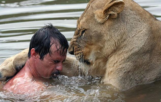 南非動物學家與獅共泳。現(xiàn)年34歲的動物學家凱文經(jīng)常采用不同尋常的方法(一起玩、一起睡覺、一起游泳等等)來和常人畏懼的動物進行交流,同時和動物們建立了很好的個人感情。和他一起游泳的獅子Meg ,體重185公斤,是個愛好游泳的獅子。