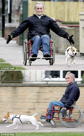 英殘疾者訓(xùn)練狗拉輪椅。據(jù)英國《每日郵報》報道,一只3歲大的杰克羅素梗每天為其殘疾主人拉輪椅,它已成為主人輪椅的小型發(fā)動機(jī)。除非遇到車輛、貓和令其感興趣的氣味,否則它不會停下來。這只名叫科迪的杰克羅素梗套著特制的挽具,每天都拉著其主人艾倫-史密斯在諾丁漢郡克利夫頓外出兜風(fēng)。57歲的史密斯稱,他的這只寵物犬拉輪椅的時速可達(dá)24公里。史密斯因幼時患小兒麻痹癥而殘疾,不得不坐輪椅,史密斯49歲的妻子多娜一直負(fù)責(zé)照顧他。史密斯說:“科迪會在道路交叉處停下來,看看是否有車輛。它的唯一缺點是,如果看到了一只貓或者另一只狗,它會停下來,像老虎那樣臥著。它的肌肉很強(qiáng)健,獸醫(yī)說,它非常健康。”史密斯稱,令人感到奇怪的是,科迪只吃超市出售的一種品牌為“英雄”的狗糧。他說:“它不吃其它食物,我們試了所有其它食物!