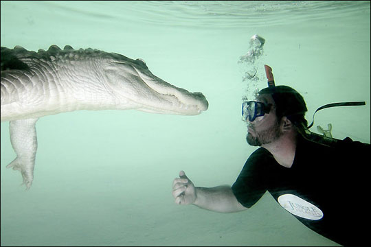 男子與鱷魚共舞。2009年1月17日,在美國佛州叢林島動物主題公園,男子Sean Manning與一條9英尺長的美洲鱷在水下上演“人鱷共舞”場面。Sean Manning沒有采取任何保護措施,在水下依靠通氣管進行呼吸,表演各種高難度動作,為觀眾上演水下人鱷大戰(zhàn)驚險場面。