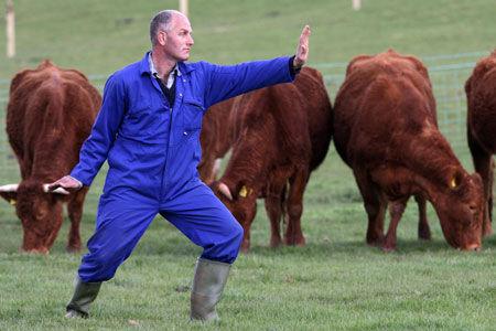 農(nóng)夫?qū)δ膛4蛱珮O!皩ε椙佟钡某烧Z大家都明白并不是一個褒義詞,但英國一個奶牛場的農(nóng)夫Rob Taverner 卻不這么認(rèn)為,每天早上都會身穿那套藍(lán)色工作服和一雙防水長靴,在他喂養(yǎng)的奶牛們面前表演太極拳。他認(rèn)為動物非常容易受到人類情感感染,太極可以讓人將一切問題拋在腦后,進(jìn)入一個較好的狀態(tài),他認(rèn)為他的表演也會讓這些奶牛感到快樂,從而產(chǎn)出更多的牛奶。好像事實也證明Rob Taverner所言非虛。