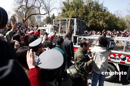 3月22日,在京生活了9個(gè)月的8只奧運(yùn)大熊貓開始起程返回四川老家,北京動(dòng)物園特地舉辦了“奧運(yùn)熊貓返川儀式”,吸引萬(wàn)名觀眾前來依依惜別。中新社發(fā) 鄭雄增 攝