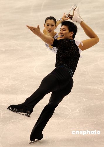 當(dāng)?shù)貢r間3月24日晚,2009年花樣滑冰世界錦標(biāo)賽在洛杉磯正式開幕。在當(dāng)天晚上舉行的雙人滑短節(jié)目比賽中,中國選手、都靈冬奧會亞軍張丹和張昊以67.42名列第三。衛(wèi)冕冠軍德國組合薩維琴科和索爾科維名列第一。25日晚將舉行雙人自由滑比賽,根據(jù)兩項總成績決出名次。圖為張丹和張昊在比賽中。中新社發(fā) 張煒 攝
