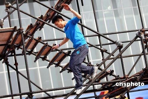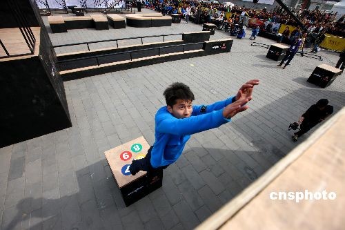 3月26日,世紀(jì)天樂(lè)杯——中國(guó)首屆跑酷運(yùn)動(dòng)國(guó)際公開賽在北京盛裝亮相。跑酷運(yùn)動(dòng)誕生于上世紀(jì)80年代的法國(guó),意為把整個(gè)城市當(dāng)作一個(gè)大訓(xùn)練場(chǎng),一切圍墻、屋頂都成為可以攀爬、穿越的對(duì)象,最初曾是法國(guó)部隊(duì)訓(xùn)練士兵的方法,目前是都市青年中流行的時(shí)尚運(yùn)動(dòng)。本次賽事為期四天,共有來(lái)自六個(gè)城市的跑酷隊(duì)參賽,比賽分團(tuán)體和個(gè)人計(jì)時(shí)賽。在當(dāng)天進(jìn)行的團(tuán)體比賽中,來(lái)自北京的“城市猴子”隊(duì)摘得桂冠。 中新社發(fā) 富田 攝