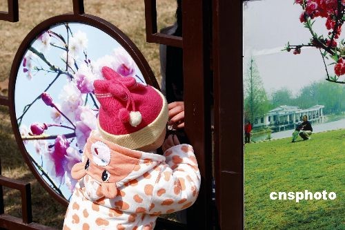 3月27日,北京又到櫻花爛漫時,玉淵潭公園櫻花節(jié)游人如織,一名天真的兒童在廣告展板處玩耍。中新社發(fā) 鄭雄增 攝