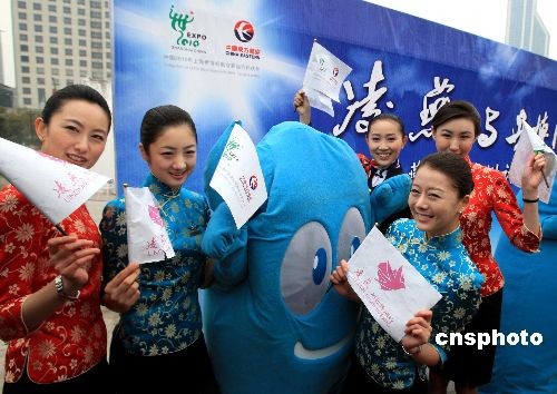 2009年3月27日,上海世博會倒計時400天,東方航空公司的中、日、韓籍空姐及“凌燕世博乘務組”,冒雨在上海人民廣場參與上海世博推廣公益活動。中新社發(fā) 潘索菲