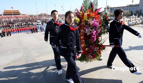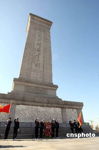 清明節(jié)臨近,來自北京市二十七中學(xué)的六名少先隊員代表4月1日向人民英雄紀(jì)念碑敬獻(xiàn)花籃,并為英烈站崗。人民英雄紀(jì)念碑前從一九八六年開始設(shè)立少年先鋒崗,旨在對少年兒童進(jìn)行愛國主義教育。今年時值建國六十周年,此項活動將從四月一日開始直至十月三十一日結(jié)束,將有五千名少先隊員輪流參加站崗。中新社發(fā) 任海霞 攝