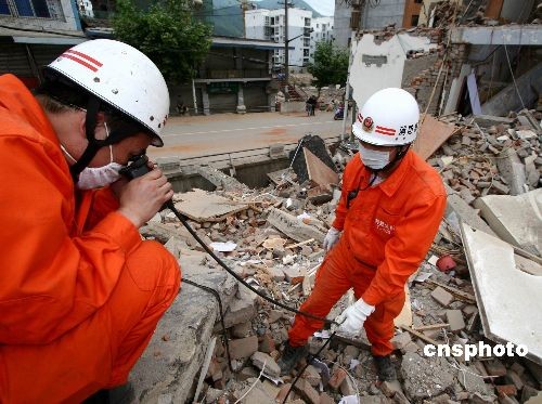 資料圖片:2008年5月15日,福州消防支隊(duì)赴川抗震救災(zāi)官兵在青川縣賓和路一家主建筑已全部坍塌的大型汽車維修廠,用生命探測(cè)儀成功解救出一名被困女工。當(dāng)時(shí),在接群眾求助后,救援隊(duì)立即趕赴現(xiàn)場(chǎng),搜索分隊(duì)首先用生命探測(cè)儀確定了女工被困的大概方位,救援分隊(duì)迅速啟動(dòng)救生氣墊,并用鐵鍬和雙手以土工的方式為被困女工打開了一條生命通道,半個(gè)小時(shí)后,被困女工被成功救出。中新社發(fā) 朱曉航 攝