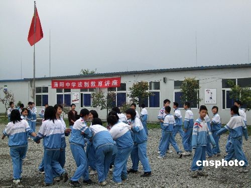 5月8日,在距離都江堰市中心不遠(yuǎn)的一所板房學(xué)校內(nèi),來自蒲陽中學(xué)的一群中學(xué)生正在歡樂嬉戲。大約一年前,他們在頃刻之間失去了學(xué)校和家園,臨時蓋起的簡易住房成了他們彌足珍惜的“樂園”,隨著都江堰各大學(xué)校援建工程的加緊建設(shè),這些孩子們下學(xué)期就有望搬入新學(xué)校,恢復(fù)震前正常的學(xué)習(xí)生活。中新社發(fā) 鄭瑩瑩 攝