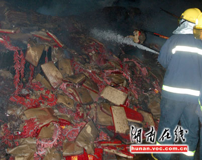 起火車輛是一輛半掛貨車,車上裝載物品正在燃燒并已經(jīng)發(fā)生爆炸,濃煙沖天,燃燒物四散飛濺。在場(chǎng)民警立刻設(shè)置警戒線,疏散圍觀群眾。距離現(xiàn)場(chǎng)一公里左右就可以看到事故地點(diǎn)濃煙滾滾,火光沖天,周圍500米內(nèi)到處是燃燒爆炸后的鞭炮殼。路上汽車已經(jīng)排成長龍,雙向車道全部封閉確保過往車輛及司乘人員的安全。株洲消防、路政部門積極救援,現(xiàn)場(chǎng)消防部門四輛消防車同時(shí)作業(yè),前2輛消防車停在距起火車輛近20米處實(shí)施滅火,第三輛車鋪設(shè)二條水帶干線出二支水槍滅火,第四輛車負(fù)責(zé)供水,阻止鞭炮繼續(xù)燃燒爆炸。