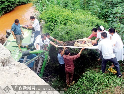 記者在現(xiàn)場找到客車司機,他說,事發(fā)時,前面有一輛摩托車發(fā)生側(cè)翻,他為避讓摩托車踩剎車,客車撞斷那花橋四五根護欄后,側(cè)翻在水溝邊?蛙囀艿絼×业乃ぢ浜笫軗p嚴(yán)重,里面的乘客被困多人。他受傷較輕,急忙爬出來后,又鉆進車廂里救人,共救了幾個人。他說,客車從蘇圩發(fā)車前往南寧,當(dāng)時車上只有30人左右,沒有超載。