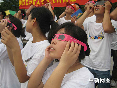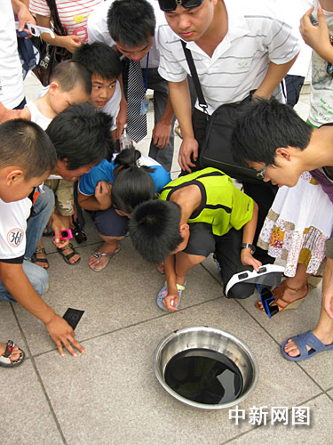 記者在觀測現(xiàn)場看到,一些天文愛好者早已架起了專業(yè)的望遠(yuǎn)鏡;而許多市民則走起“平民路線”,戴起墨色眼鏡或黑色遮光玻璃片擋住太陽光,以便更清晰地看清日食;更有“經(jīng)驗老道”的市民,在臉盆里倒上墨汁,觀看太陽的倒影,平添了幾分傳統(tǒng)神秘色彩,引來了無數(shù)的圍觀者。