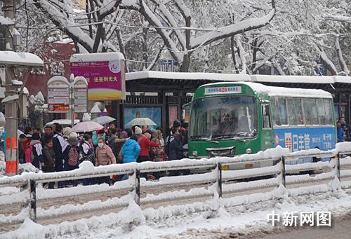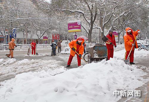 11日下午,在山西太原市街頭,一片銀裝素裹。街頭兩旁一些樹(shù)枝被大雪壓斷,受暴雪的影響街道上行駛的車輛明顯減少,一些環(huán)衛(wèi)工人正在緊急清掃路面上的積雪,居民出行只能選擇步行或乘坐公交汽車。攝影:張雷杰