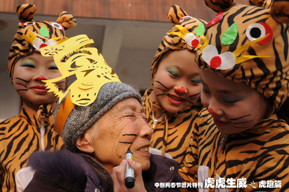 2月5日,河南省南陽(yáng)市第十六小學(xué)的孩子們裝扮成可愛(ài)的虎娃,向該市臥龍敬老院的老人們送去了新春的祝福。中新社發(fā) 付海厚 攝