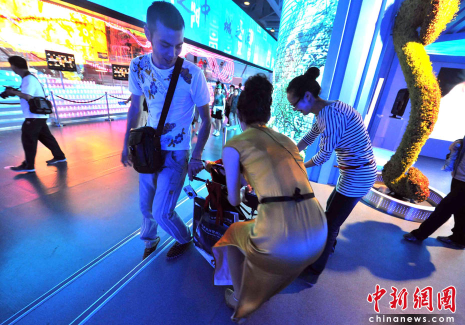 5月3日,上海世博會中國山東館一位禮儀小姐始終笑容可掬,許多參觀者都喜歡與外秀內(nèi)慧的她拍一張留影照。當一對夫婦推著嬰兒車經(jīng)過時,她迅速上前幫助抬下階梯。她因而享有全場最善解人意的禮儀小姐美稱。中新社發(fā) 賈國榮 攝