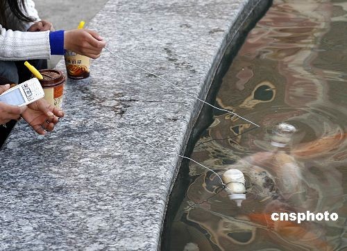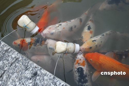 3月中旬,工作人員喂養(yǎng)“喝奶”的魚。在浙江東陽橫店影視城香港街景點內,養(yǎng)在水壇中的觀賞錦鯉是普通錦鯉與日本某錦鯉雜交后培育的品種,喂養(yǎng)它們則需要將飼料裝灌進嬰幼兒奶瓶中,該飼料的顏色如“乳奶”一般,然后將奶瓶用鐵絲系住放入水中,隨后,這些魚兒就會圍攏過來,爭搶著用奶嘴吸“奶”喝了。