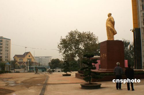 | 2006年11月19日,湖南長沙金像廣場主體完工,毛主席鍍金雕像佇立在廣場中央,偉人英姿栩栩如生。金像廣場因毛主席鍍金雕像而得名。這座毛主席雕像原為1967年由原湖南制藥廠與湖南大學(xué)雕塑系共同設(shè)計(jì),采用丁字灣麻石雕塑而成并一直安放在此。今年5月,湖南制藥有限公司斥資對雕像進(jìn)行鍍金和修繕,并配套修建近4000平米的金像廣場,以供市民紀(jì)念和休閑之用。 毛主席雕像及金像廣場今年4月開始修繕裝飾,主席像和基座總高度為7.1米,基座設(shè)計(jì)將偉人生平、豐功偉績等富有紀(jì)念意義的日子融入其中,如基座第一層周長1949厘米,第二層周長10.1米,寓意新中國誕生之日,基座表面裝飾采用“中國紅”花崗巖。根據(jù)設(shè)計(jì),金像廣場由花壇、主席金像、詩詞展覽區(qū)三部分組成。毛主席雕像已被長沙市政府公布為不可移動文物保護(hù)單位。中新社發(fā) 殷中民 攝