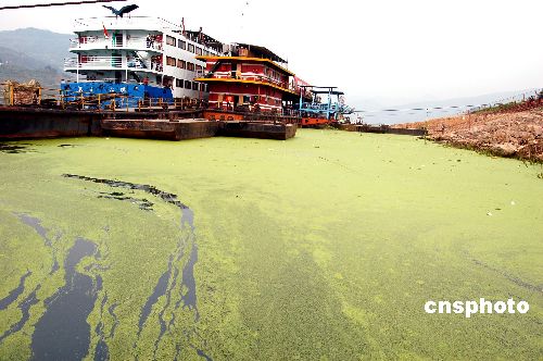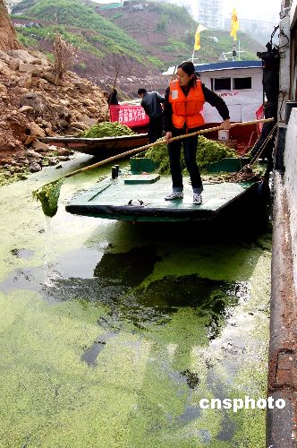 | 4月12日,重慶市云陽(yáng)縣環(huán)衛(wèi)部門再次出動(dòng)專業(yè)清漂隊(duì)伍“阻擊”入侵長(zhǎng)江的浮萍。由于前段時(shí)間長(zhǎng)江一級(jí)支流澎溪河流域普降暴雨,大量來(lái)自山塘、渠堰的浮萍隨春水匯集澎溪河,并逐步繁衍集聚在河面及河汊,其中一部分浮萍隨水流進(jìn)入了長(zhǎng)江云陽(yáng)苦草沱至長(zhǎng)江大橋段。為了阻擊這一有害水上漂浮植物對(duì)三峽庫(kù)區(qū)生態(tài)的影響,云陽(yáng)清漂隊(duì)伍自3月5日開(kāi)始,每日出動(dòng)16艘應(yīng)急清漂船和一艘自動(dòng)清漂船,由56位清漂隊(duì)員分別在澎溪河高陽(yáng)段、澎溪河長(zhǎng)江入口處和長(zhǎng)江苦草沱的三個(gè)打撈點(diǎn)進(jìn)行突擊清理,現(xiàn)已撈起浮萍2500余噸。中新社發(fā) 周斌 攝