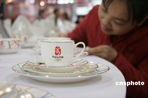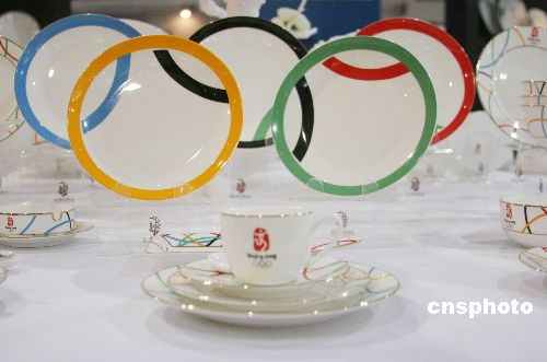 | 4月18日,印有“奧運(yùn)五環(huán)”和“2008北京奧運(yùn)”標(biāo)志的成套餐具亮相北京第四屆中國國際飯店業(yè)博覽會,引來不少觀眾駐足觀看。本屆博覽會以“展示飯店風(fēng)采、創(chuàng)建綠色飯店、迎接綠色奧運(yùn)”為主題,以巨大的市場商機(jī)為導(dǎo)向,以雄厚的行業(yè)背景為后盾,將吸引國內(nèi)外上萬家星級賓館、酒店前來參觀采購,并力邀國內(nèi)外百余家知名行業(yè)組織及著名企業(yè)參加,力圖充分實現(xiàn)“行業(yè)交流、品牌塑造、采購交易、合作洽談”四大功能。中新社發(fā) 吳芒子 攝