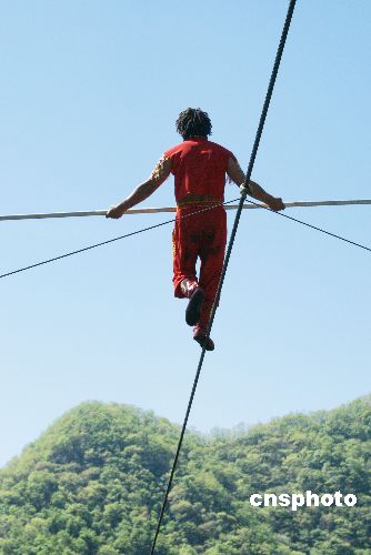 | 4月18日,保持有五項世界紀錄的“高空王子”艾斯開爾在著名的世界地質(zhì)公園、國家4A級風景區(qū)河南濟源王屋山間一百多米高的空中行走。他將要創(chuàng)造高空百米速跑和在高空生存40天的吉尼斯世界紀錄。艾斯開爾是新疆喀什英吉沙縣人,是維吾爾族“達瓦孜”的第六代傳人。艾斯開爾在王屋山風景名勝區(qū)專門搭建的高空鋼索高200m,總長度為700m。他自己保持的在高空生存37天的紀錄是2005年5月在南京玄武湖上創(chuàng)造的紀錄,至今無人打破,這次他將努力刷新紀錄。中新社發(fā) 平白 攝