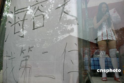 | 2007年4月30日,行為藝術(shù)家也夫和海容天天一起在櫥窗內(nèi)生存體驗已經(jīng)過去了七天,開始了新的一個周期。當(dāng)日凌晨,記者收到海容天天的短信:“海容天天已經(jīng)完成一個星期的輪回,并且為也夫?qū)ふ业诙粰淮捌拮,直到行為結(jié)束!痹诎滋斓牟稍L中,記者看到海容天天的浴簾上也寫有“為也夫?qū)ふ业诙粰淮捌拮印钡淖謽印T诨卮鹩浾咛釂枙r,海容天天說前日晚間到了女性的生理周期,情緒很不好,所以有了這樣的沖動,但在白天的感覺要好了很多,她會堅持下去。當(dāng)然如果有人愿意作也夫的第二位櫥窗妻子,她也會選擇退出。他們的“櫥窗計劃”從4月22日下午開始,原定到5月22日下午結(jié)束。中新社發(fā) 魯谷 攝