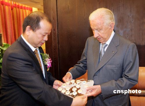 | 六月二十五日,奧運會史上迄今為止最全的“歷屆夏季奧運會吉祥物和會徽紀(jì)念章”(亞歐版)在北京舉行的第十三屆奧林匹克收藏博覽會上亮相,國際奧委會名譽主席薩馬蘭奇為該套產(chǎn)品揭幕。該產(chǎn)品分為金、銀、銅鍍金三個系列,由中國印鈔造幣總公司鑄造發(fā)行,中鈔國鼎投資有限公司總經(jīng)銷,是目前國際上唯一一套經(jīng)國際奧林匹克運動委員會、北京奧組委正式授權(quán)的歷屆奧運產(chǎn)品。圖為中國印鈔造幣總公司副總經(jīng)理、中鈔國鼎投資有限公司董事長張數(shù)滄向薩馬蘭奇贈送紀(jì)念品。中新社發(fā) 毛建軍 攝