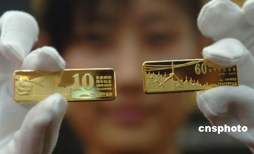 | 7月4日,內蒙古自治區(qū)成立60周年紀念金條、香港回歸10周年紀念金條同時在北京舉行首發(fā)式。前者限量發(fā)行999套,每套包含兩根30克AU9999金條,共重60克,寓意內蒙古自治區(qū)成立60周年。后者限量發(fā)行1997套,寓意香港于1997年回歸祖國,每套含2根25克AU9999金條。它們均由中國國家博物館藝術品中心監(jiān)制。中新社發(fā) 鄒憲 攝