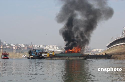 1月3日13時20分許,廣西梧州桂江上一艘貨船突然起火。由于火勢大,貨船噴出的火苗很快點燃?吭谂赃叺牧硪凰邑涊啠⑽<班徑10多艘貨輪。梧州消防支隊調(diào)集水上中隊和河?xùn)|中隊官兵奮戰(zhàn)近50分鐘,終于將大火撲滅,事故中無人員傷亡。據(jù)了解,當時起火貨船靠岸后船主上岸辦事,不料隨后船艙起火。中新社發(fā) 何永崇 攝