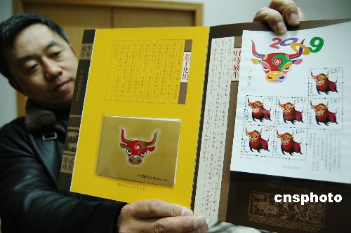 2009年1月4日,即將發(fā)行的《己丑年》特種郵票運(yùn)抵蘇州。據(jù)悉,國(guó)家郵政局和中國(guó)郵政集團(tuán)公司將于1月5日在蘇州首發(fā)該套以“奔牛”為形象的《己丑年》特種郵票。該次發(fā)行的《己丑年》郵票一套一枚,面值1.2元。郵票圖案為健壯倔強(qiáng)的奔牛形象,表現(xiàn)出奮力向前的視覺(jué)效果,寓意人們對(duì)生肖牛年的期望與寄托。中新社發(fā) 朱子寒 攝